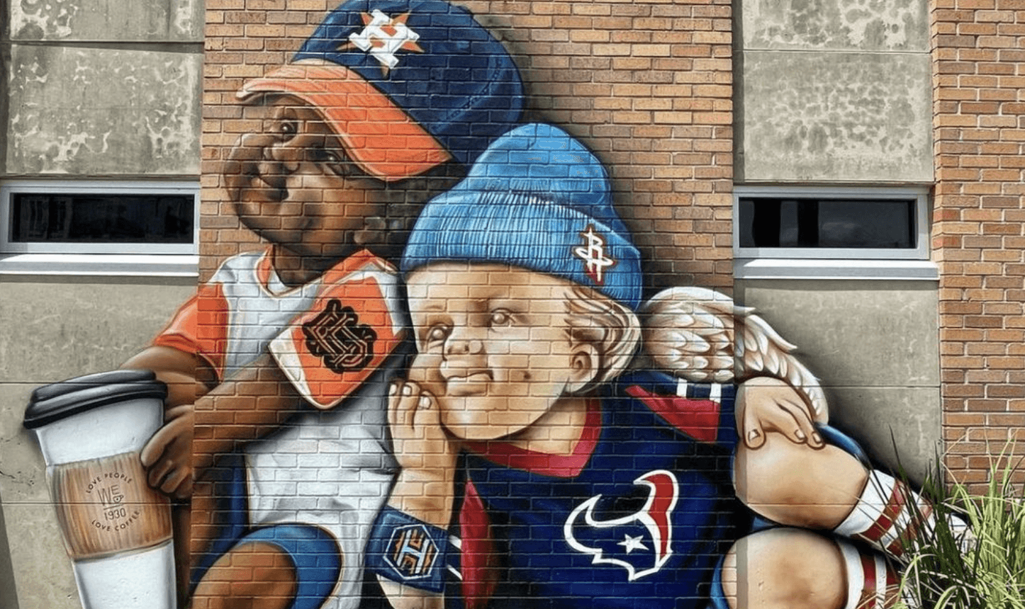 Our mural is a statement to the community, reflecting who we are. The mural features references to Houston highlighting our love for the city. We also emphasize diversity, with cherubs in the mural each bringing something unique.